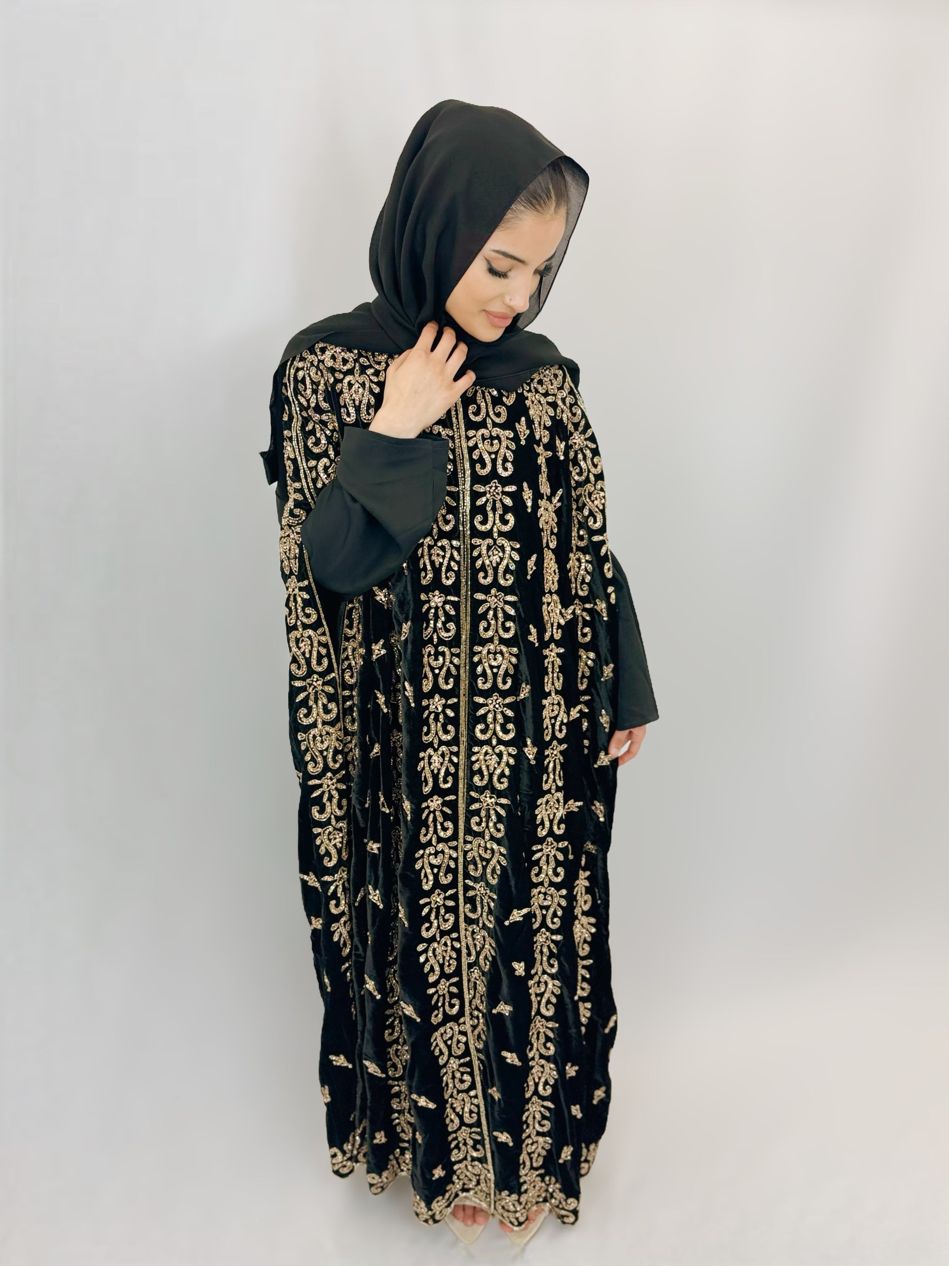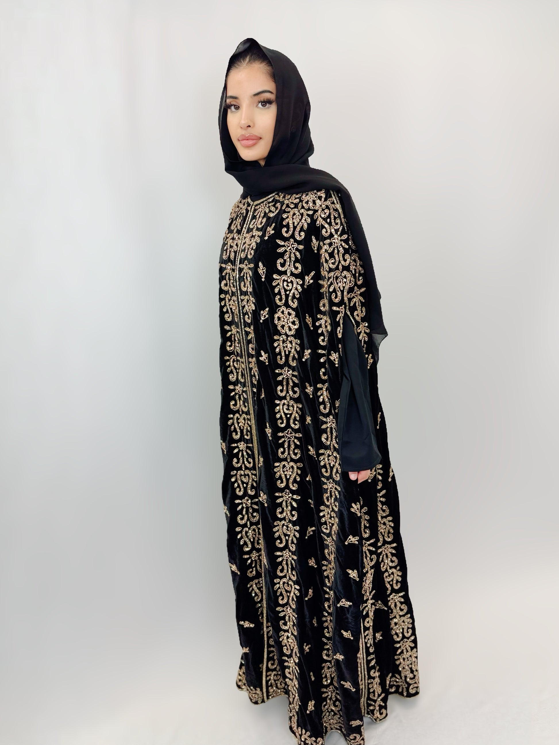 Wrap yourself in elegance with our Sehar Abaya. Made from luxurious velvet, this abaya features a heavy hand beaded all round cape that exudes royalty. Perfect for any special occasion, this regal abaya will make you feel like a true queen. Elevate your wardrobe with our Sehar Abaya today!