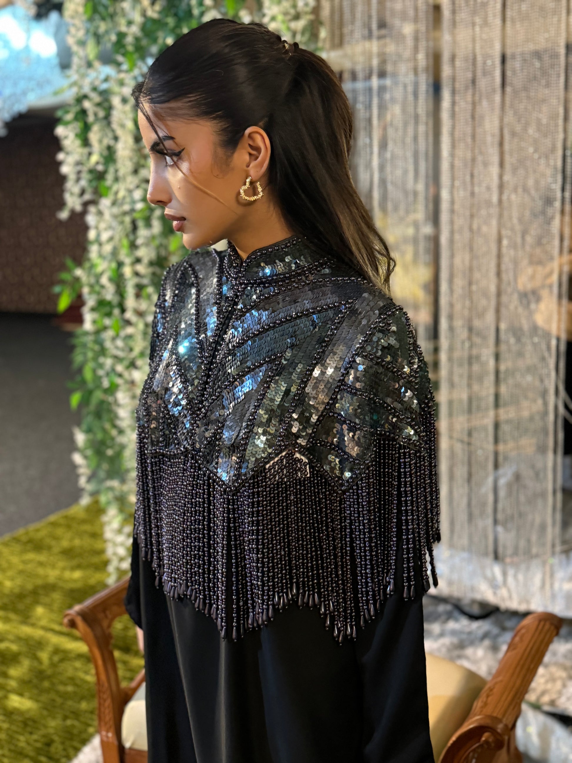 Experience regal elegance with this luxurious regal embellished cape. Featuring intricate beaded detailing, this eye-catching piece will make you feel like royalty! Add a touch of glamour and opulence to your look with this stunning cape!