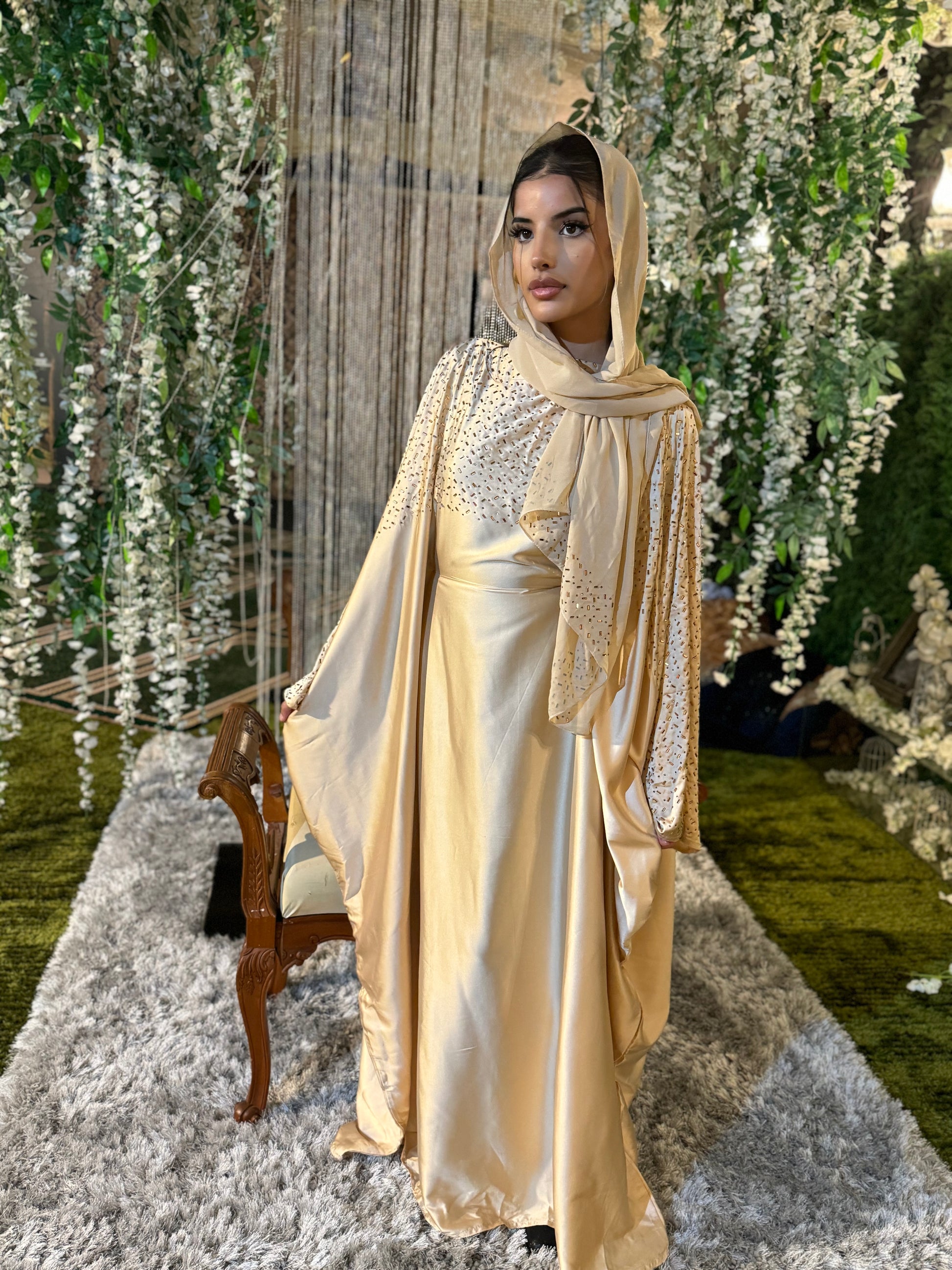 Our Premium satin kaftaan is a timeless classic that evokes the elegance of refined style. Hand crafted with bezeled stones on top half of the kaftaan. Ties on the inner to cinch the waistline. This piece is sure to turn heads and make you stand out from the crowd.
